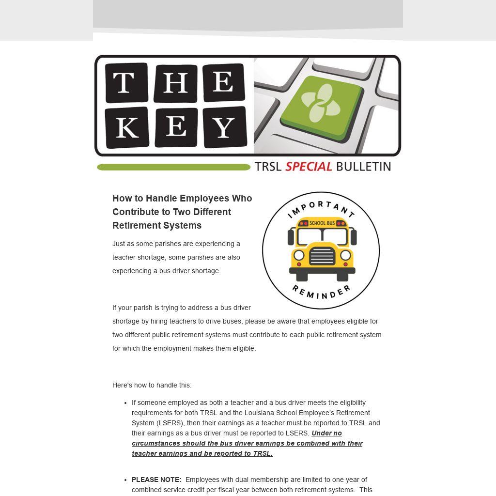 If your parish is trying to address a bus driver shortage by hiring teachers to drive buses, please be aware that employees eligible for two different public retirement systems must contribute to each public retirement system for which the employment makes them eligible.