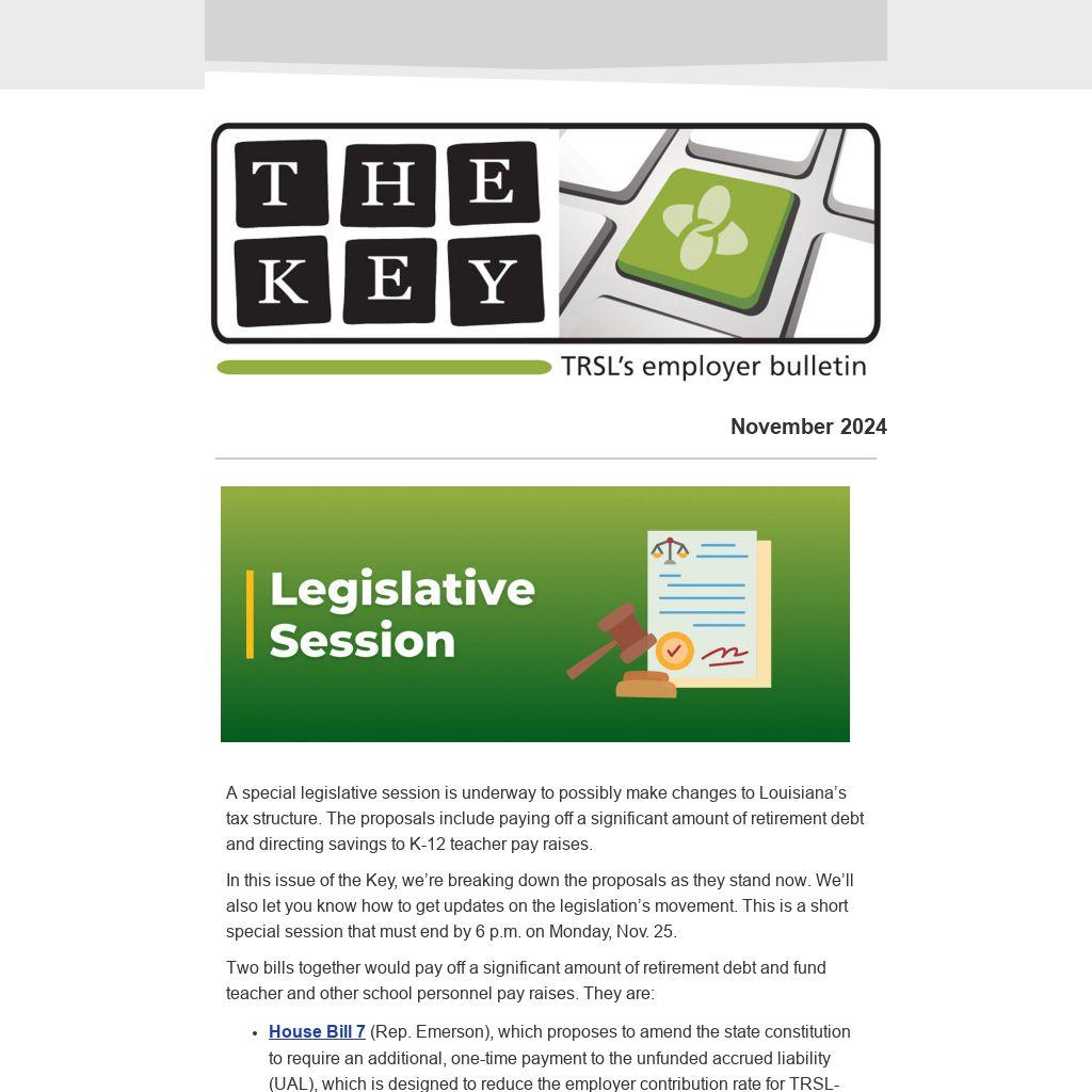 - House Bill 7 (Rep. Emerson), which proposes to amend the state constitution to require an additional, one-time payment to the unfunded accrued liability (UAL), which is designed to reduce the employer contribution rate for TRSL-participating employers, and further require that all TRSL-participating employers provide permanent pay raises for teacher/school personnel using the savings. HB 7 also makes a variety of other constitutional changes related to state finances.