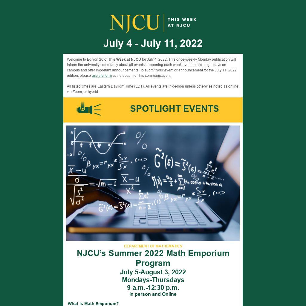 Welcome to Edition 26 of This Week at NJCU for July 4, 2022. This once-weekly Monday publication will inform the university community about all events happening each week over the next eight days on campus and offer important announcements. To submit your event or announcement for the July 11, 2022 edition, please use the form at the bottom of this communication.