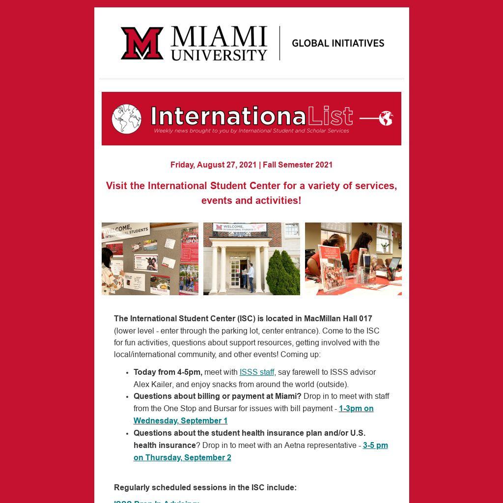 - Today from 4-5pm, meet with ISSS staff, say farewell to ISSS advisor Alex Kailer, and enjoy snacks from around the world (outside).
