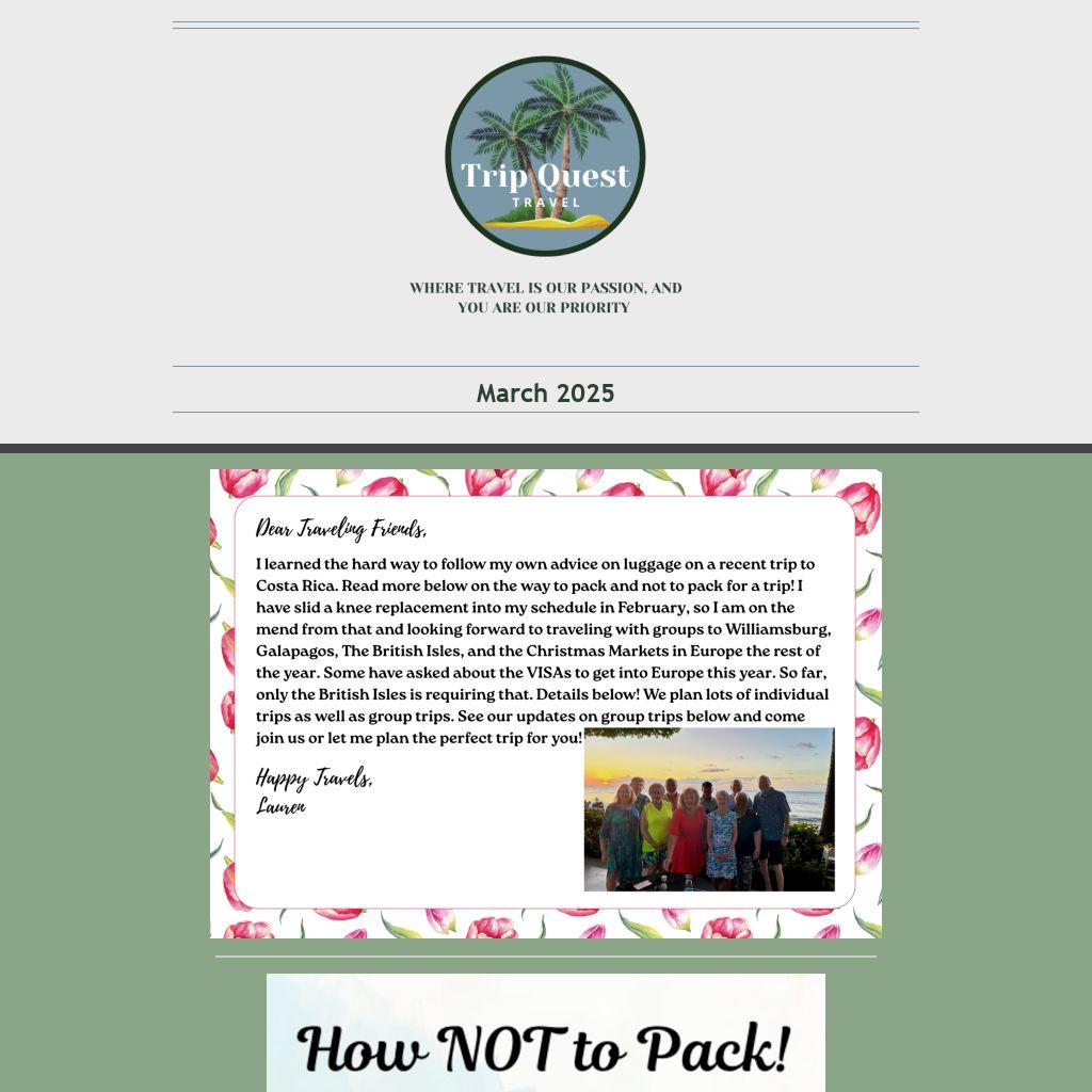 I am Lauren Williams, owner of Trip Quest Travel Services for the past ten years. Moving from three decades in education to becoming a travel consultant has caused me to shift from “The Doctor of Education” to “The Doctor of Travel.” My clients are often just like me – they want a rejuvenating vacation that teaches them about the world and the cultures around them. I love beautiful scenery, exploring new places, and learning something new every day! Aside from travel, I stay busy with my husband, Steve, who has joined me in the travel business, and our four children and thirteen grandchildren. Being active in the church and in our community feeds our souls as well. I love to play pickleball and bridge when I am not helping clients plan that perfect trip! Because our world is so much smaller now, I am happy to work with clients wherever they might live…but by referral only. Let me know if you have friends or family who would like to be added to my monthly newsletter list! Also, let me know if there is something you’d like to know more about!
