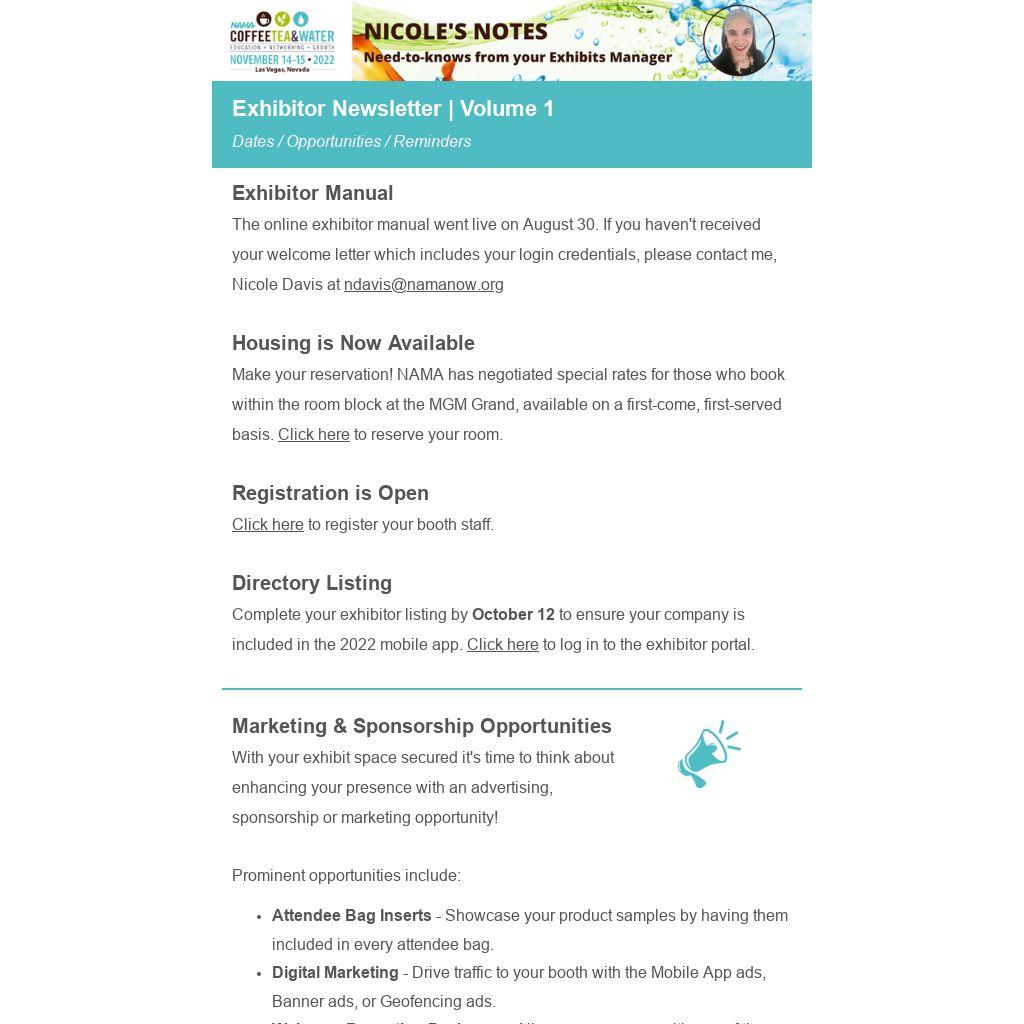 Exhibitor Manual The online exhibitor manual went live on August 30. If you haven't received your welcome letter which includes your login credentials, please contact me, Nicole Davis at ndavis@namanow.org