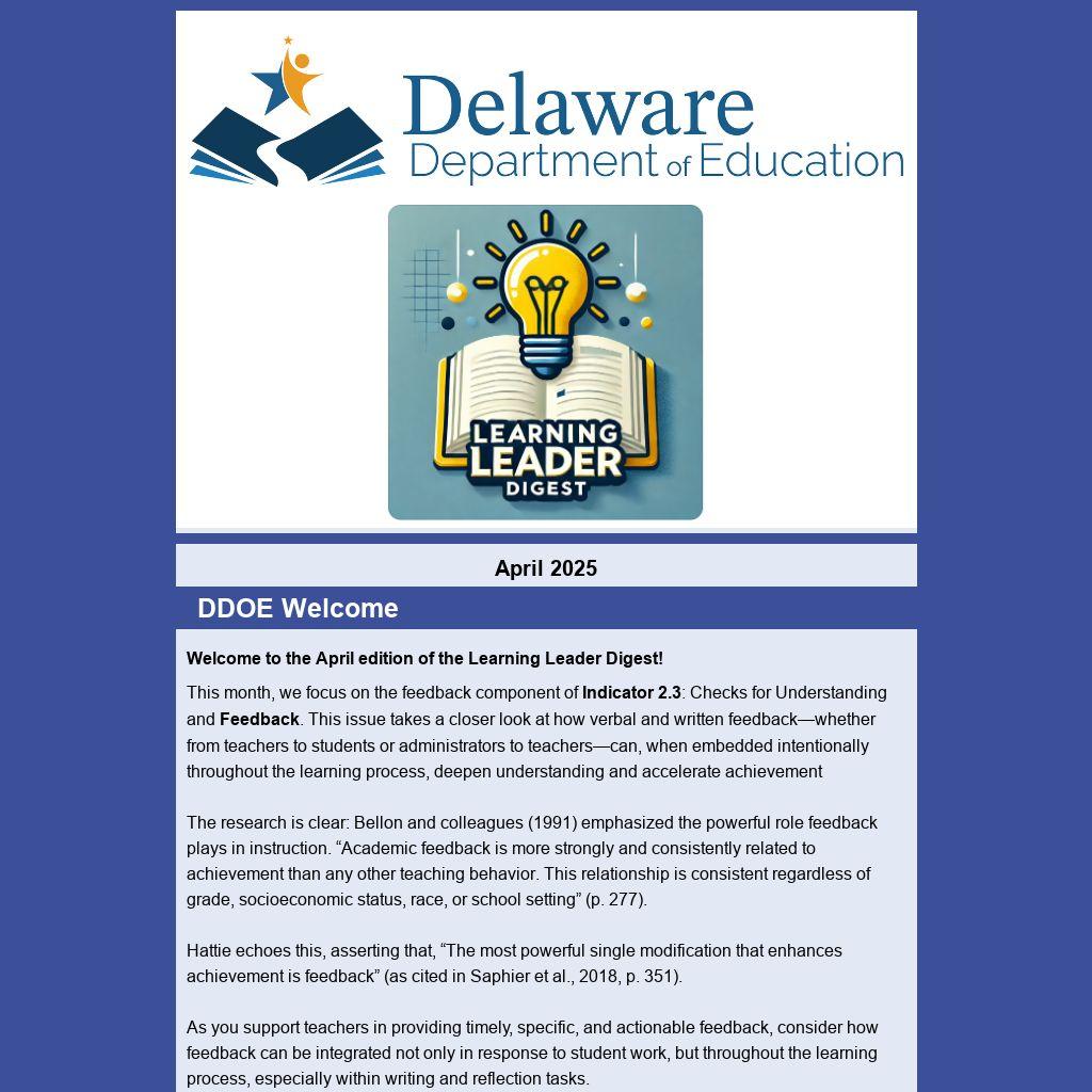 Registration is now open for the 2025–2026 school year Delaware Teacher Growth and Support System (DTGSS) credentialing course. This 24-hour virtual course is required for all administrators who conduct teacher evaluations. Sessions begin in July 2025, and participants will select one of eight available cohorts that best fits their schedule. Register in PDMS #43527. See flyer for more information. (Contact: Angela Socorso)