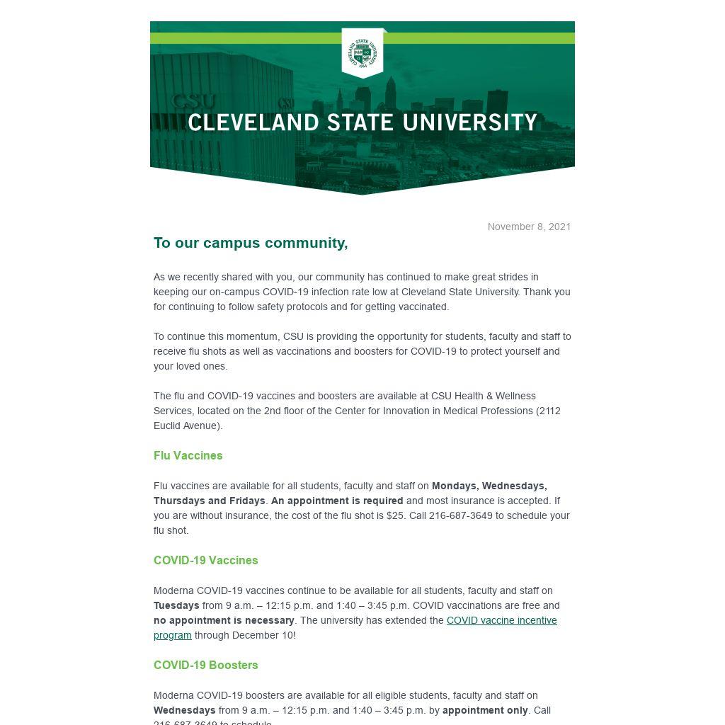 As we recently shared with you, our community has continued to make great strides in keeping our on-campus COVID-19 infection rate low at Cleveland State University. Thank you for continuing to follow safety protocols and for getting vaccinated.