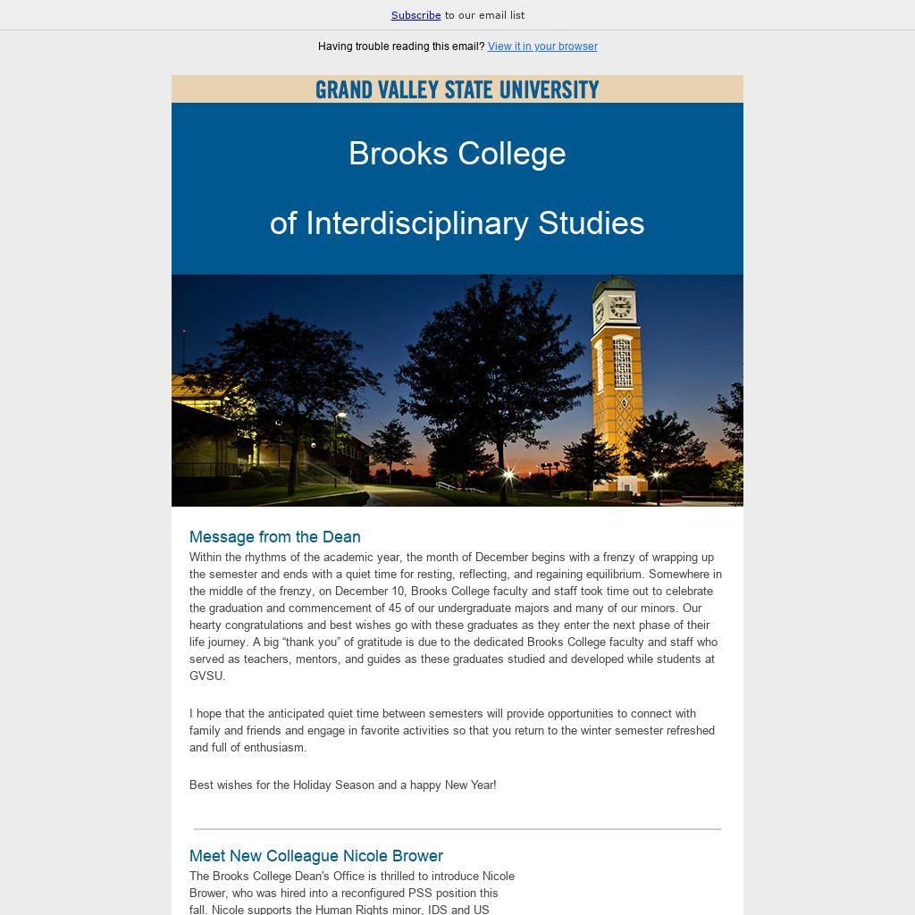 Within the rhythms of the academic year, the month of December begins with a frenzy of wrapping up the semester and ends with a quiet time for resting, reflecting, and regaining equilibrium. Somewhere in the middle of the frenzy, on December 10, Brooks College faculty and staff took time out to celebrate the graduation and commencement of 45 of our undergraduate majors and many of our minors. Our hearty congratulations and best wishes go with these graduates as they enter the next phase of their life journey. A big “thank you” of gratitude is due to the dedicated Brooks College faculty and staff who served as teachers, mentors, and guides as these graduates studied and developed while students at GVSU.