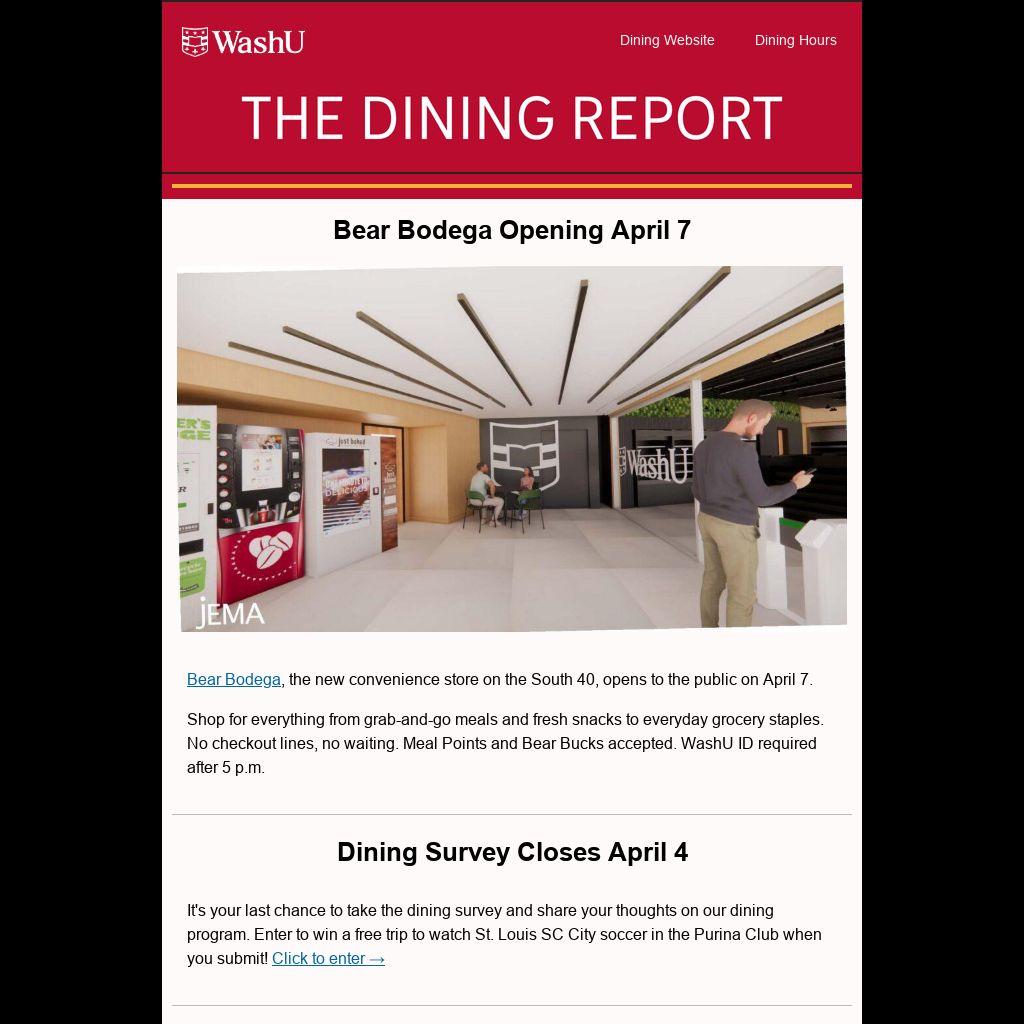 It's your last chance to take the dining survey and share your thoughts on our dining program. Enter to win a free trip to watch St. Louis SC City soccer in the Purina Club when you submit! Click to enter →