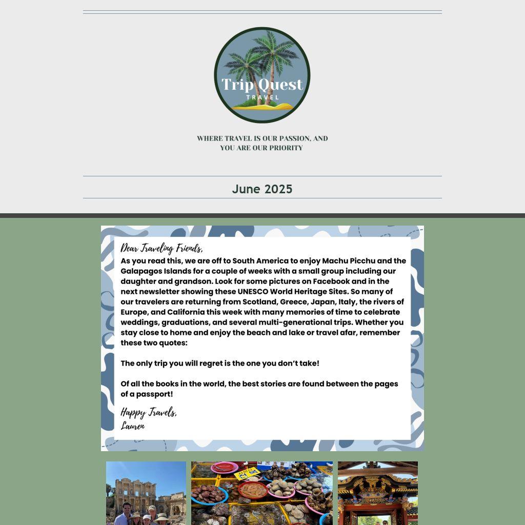 I am Lauren Williams, owner of Trip Quest Travel Services for the past ten years. Moving from three decades in education to becoming a travel consultant has caused me to shift from “The Doctor of Education” to “The Doctor of Travel.” My clients are often just like me – they want a rejuvenating vacation that teaches them about the world and the cultures around them. I love beautiful scenery, exploring new places, and learning something new every day! Aside from travel, I stay busy with my husband, Steve, who has joined me in the travel business, and our four children and thirteen grandchildren. Being active in the church and in our community feeds our souls as well. I love to play pickleball and bridge when I am not helping clients plan that perfect trip! Because our world is so much smaller now, I am happy to work with clients wherever they might live…but by referral only. Let me know if you have friends or family who would like to be added to my monthly newsletter list! Also, let me know if there is something you’d like to know more about!