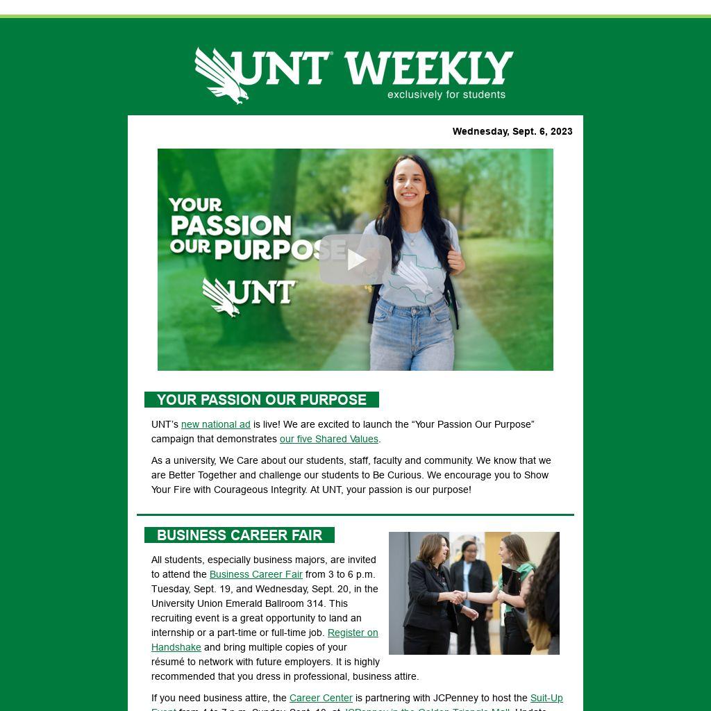 If you need business attire, the Career Center is partnering with JCPenney to host the Suit-Up Event from 4 to 7 p.m. Sunday, Sept. 10, at JCPenney in the Golden Triangle Mall. Update your professional wardrobe with up to 50% off select career-wear, shoes and accessories. Receive an additional 30% off when you check in with your UNT student ID at the event.