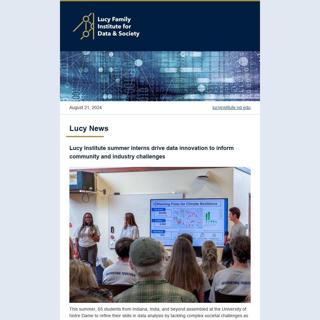 This summer, 65 students from Indiana, India, and beyond assembled at the University of Notre Dame to refine their skills in data analysis by tackling complex societal challenges as part of the Lucy Family Institute for Data & Society’s summer internship program.