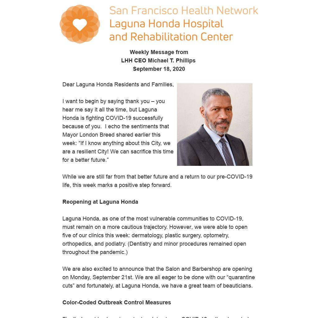 I want to begin by saying thank you – you hear me say it all the time, but Laguna Honda is fighting COVID-19 successfully because of you. I echo the sentiments that Mayor London Breed shared earlier this week: “If I know anything about this City, we are a resilient City! We can sacrifice this time for a better future.”