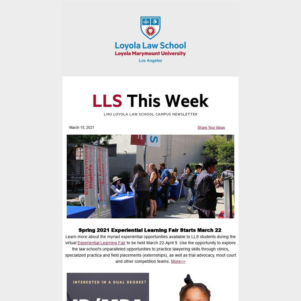 First-year full-time law students: Interested in earning an MBA along with your JD? Learn about the joint JD/MBA program on Tuesday, March 16 from 12-1 p.m. from reps from the LMU College of Business Administration MBA Programs office and LLS Student Affairs, as well as current JD/MBA students. More>>