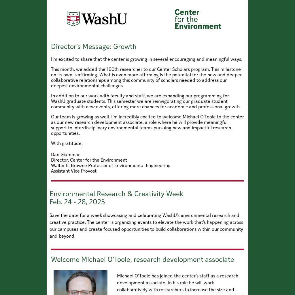 Our team is growing as well. I'm incredibly excited to welcome Michael O'Toole to the center as our new research development associate, a role where he will provide meaningful support to interdisciplinary environmental teams pursuing new and impactful research opportunities.