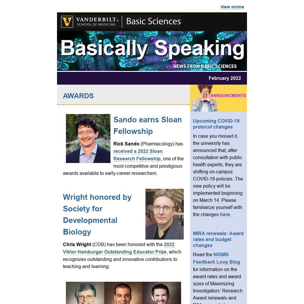 This newsletter recognizes the achievements and latest discoveries of students, postdocs, faculty, and staff associated with Basic Sciences departments, centers, and cores or who carry out basic biomedical research at Vanderbilt.