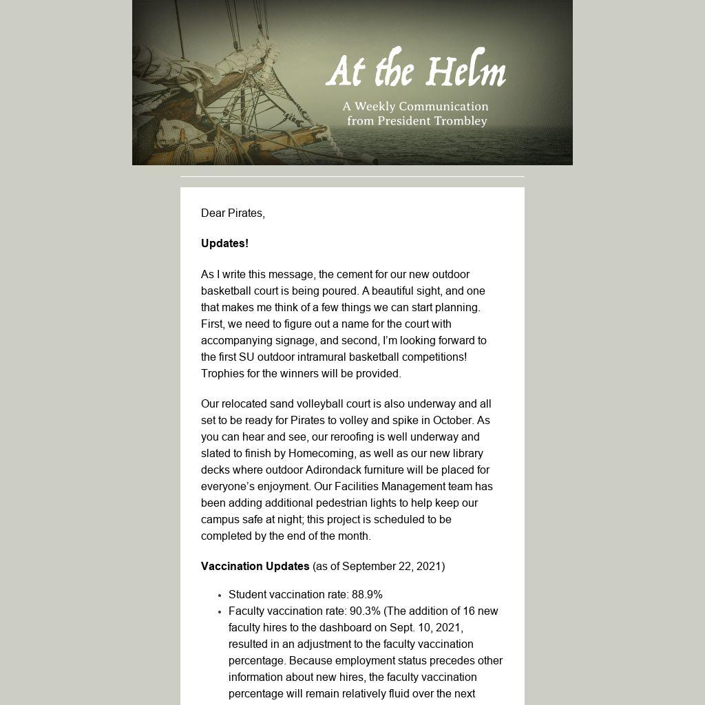 Students you are very close to reaching your 90% vaccination rate goal. Remember, Pirates, when you reach your goal (I am cheering you on!), you will receive a tangible gift from the Captain (in addition to the peace of mind knowing you are better protected against COVID-19). Once the positivity rate in Williamson County declines to a safer level, the Health and Safety Committee will reconsider current masking policies.