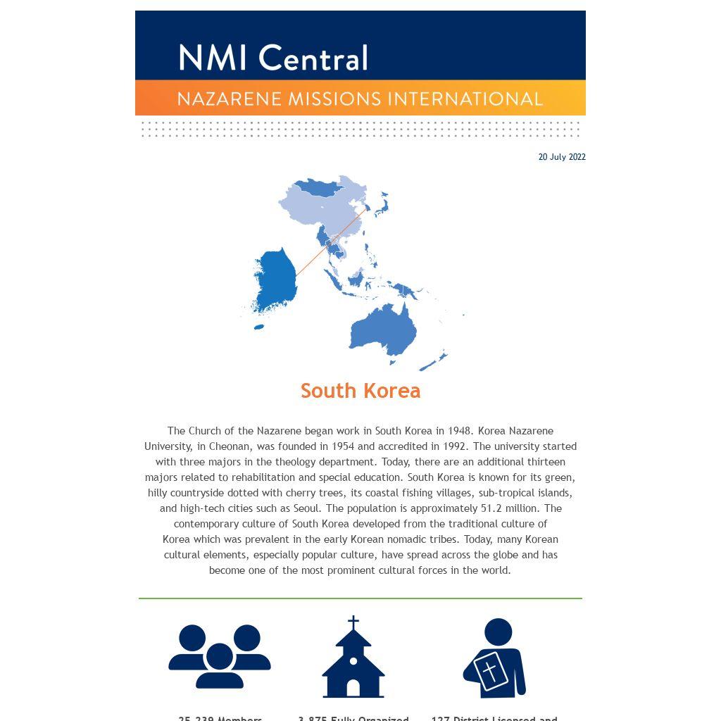 The Church of the Nazarene began work in South Korea in 1948. Korea Nazarene University, in Cheonan, was founded in 1954 and accredited in 1992. The university started with three majors in the theology department. Today, there are an additional thirteen majors related to rehabilitation and special education. South Korea is known for its green, hilly countryside dotted with cherry trees, its coastal fishing villages, sub-tropical islands, and high-tech cities such as Seoul. The population is approximately 51.2 million. The contemporary culture of South Korea developed from the traditional culture of Korea which was prevalent in the early Korean nomadic tribes. Today, many Korean cultural elements, especially popular culture, have spread across the globe and has become one of the most prominent cultural forces in the world.