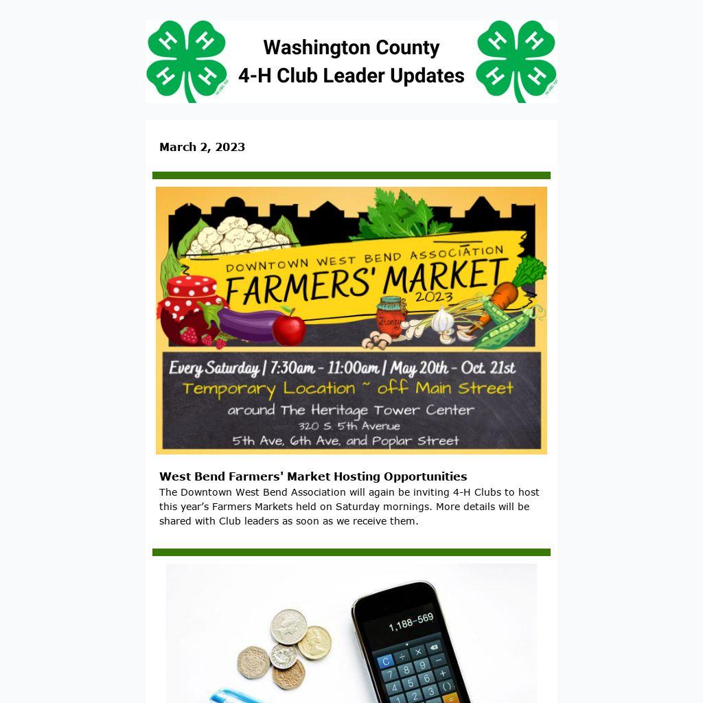 Deadline for submitting any items, including income/expense forms, for the Leaders Association treasurer is Monday, March 20. Note that items received in the Extension office after March 20 will be placed in the packet of items to be picked up in April. The reason for the strict deadline is due to scheduling: Client First needs the packet by the 23rd of the month, so our volunteer treasurer must review and do any necessary follow-up on items received, record all items, take deposits to the bank, organize the paperwork, and submit all to Client First by March 23.
