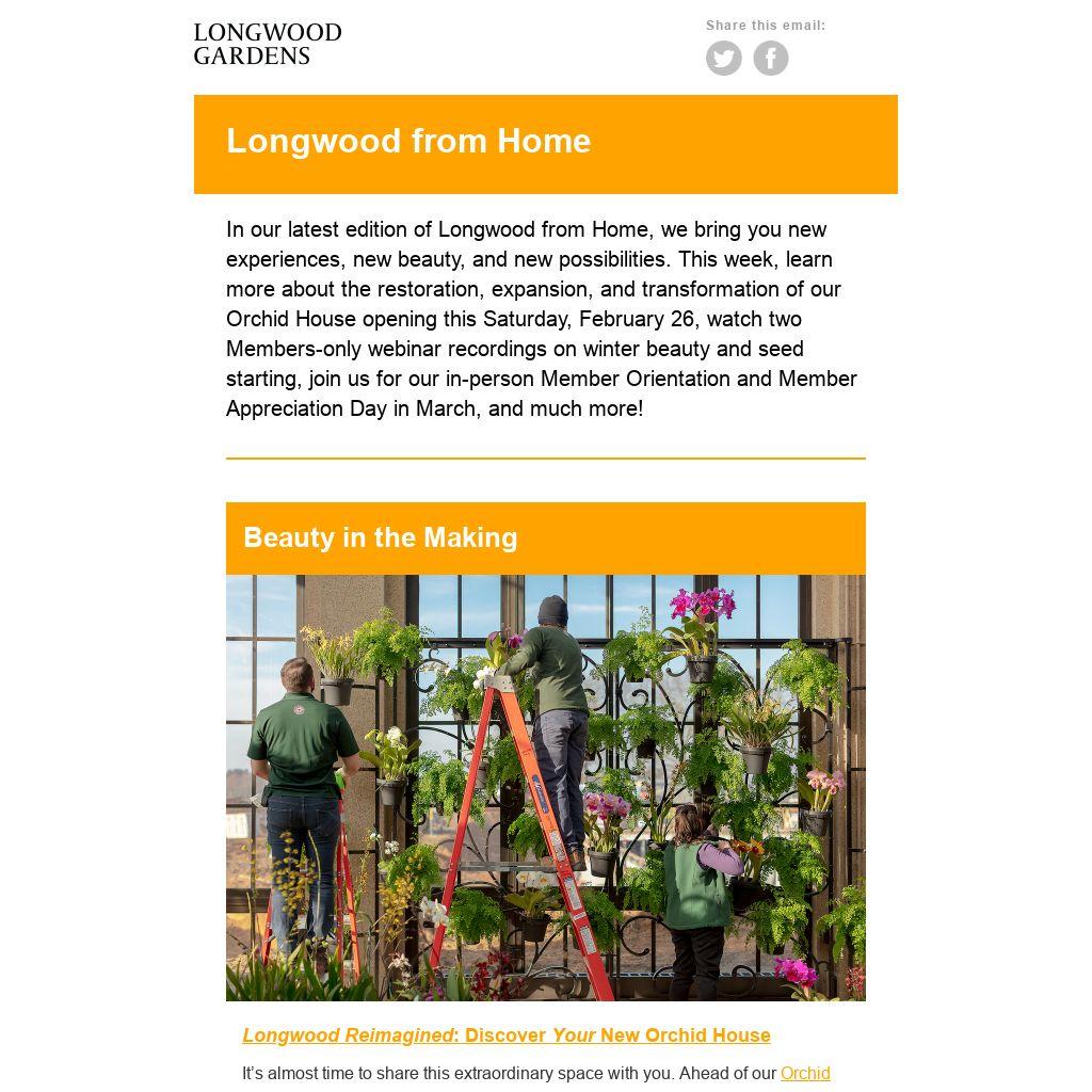 In our latest edition of Longwood from Home, we bring you new experiences, new beauty, and new possibilities. This week, learn more about the restoration, expansion, and transformation of our Orchid House opening this Saturday, February 26, watch two Members-only webinar recordings on winter beauty and seed starting, join us for our in-person Member Orientation and Member Appreciation Day in March, and much more!