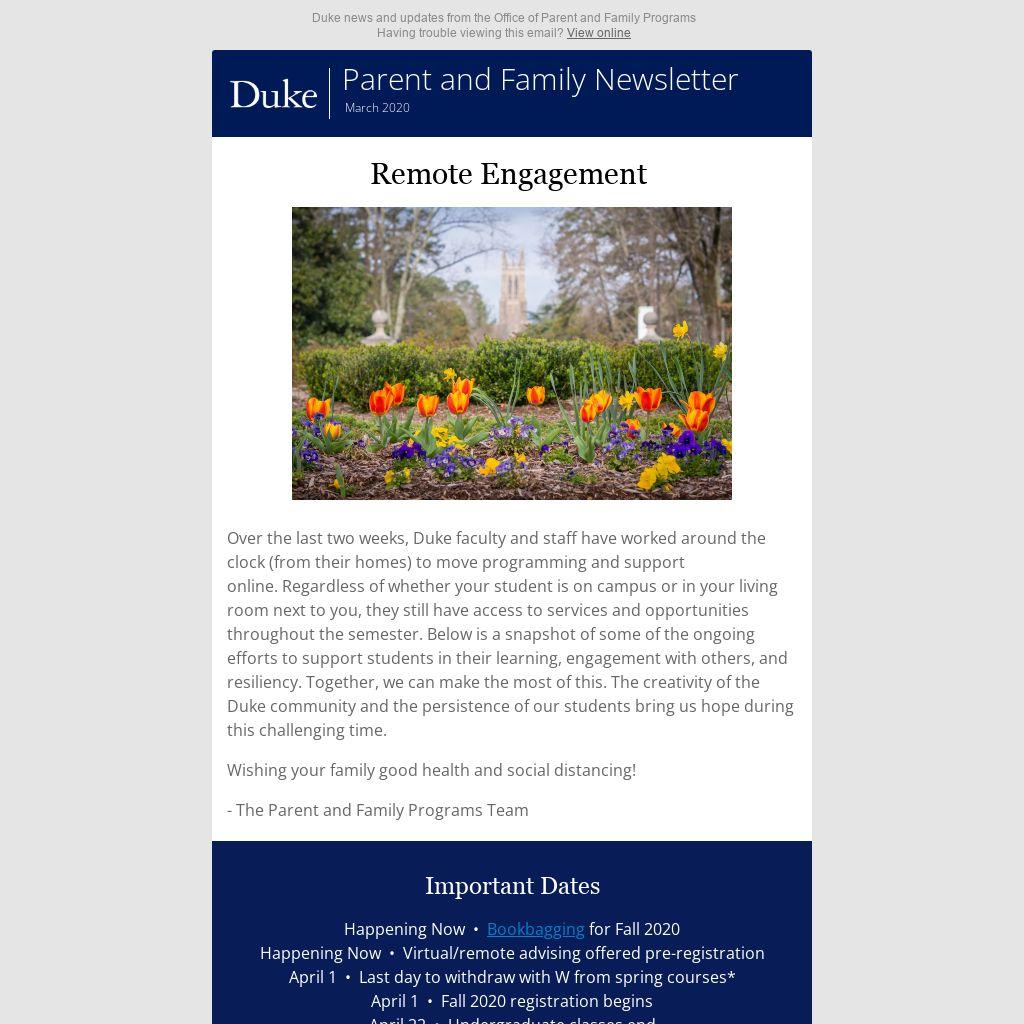 Over the last two weeks, Duke faculty and staff have worked around the clock (from their homes) to move programming and support online. Regardless of whether your student is on campus or in your living room next to you, they still have access to services and opportunities throughout the semester. Below is a snapshot of some of the ongoing efforts to support students in their learning, engagement with others, and resiliency. Together, we can make the most of this. The creativity of the Duke community and the persistence of our students bring us hope during this challenging time.