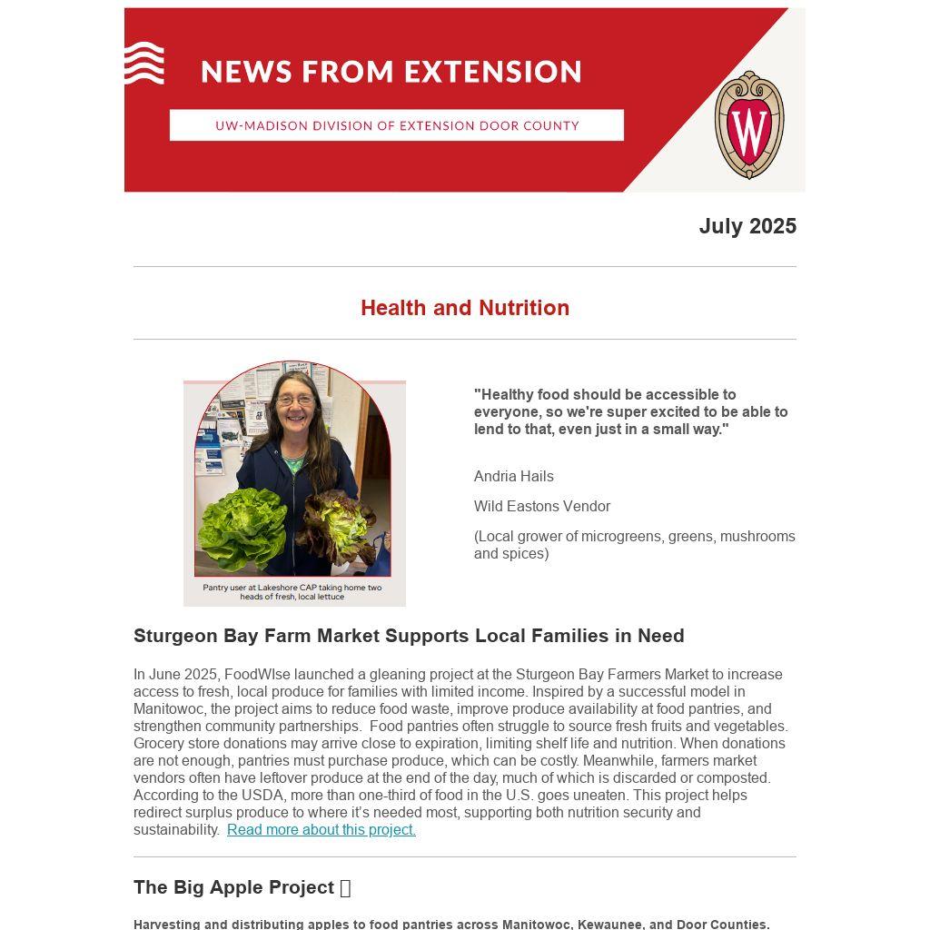 FoodWIse interviews with pantry managers in Manitowoc, Kewaunee, and Door Counties, identified fresh produce access as a concern. Many food pantries lack fresh produce, stocking only canned fruits and vegetables. FoodWIse coordinator Laura Apfelbeck worked with Feeding America Eastern Wisconsin, securing grant funds to pilot a program aimed at collecting unsold apples from the Door County Peninsular Research Station in Sturgeon Bay and delivering them to food pantries in Door, Kewaunee, and Manitowoc Counties. Continue reading here.