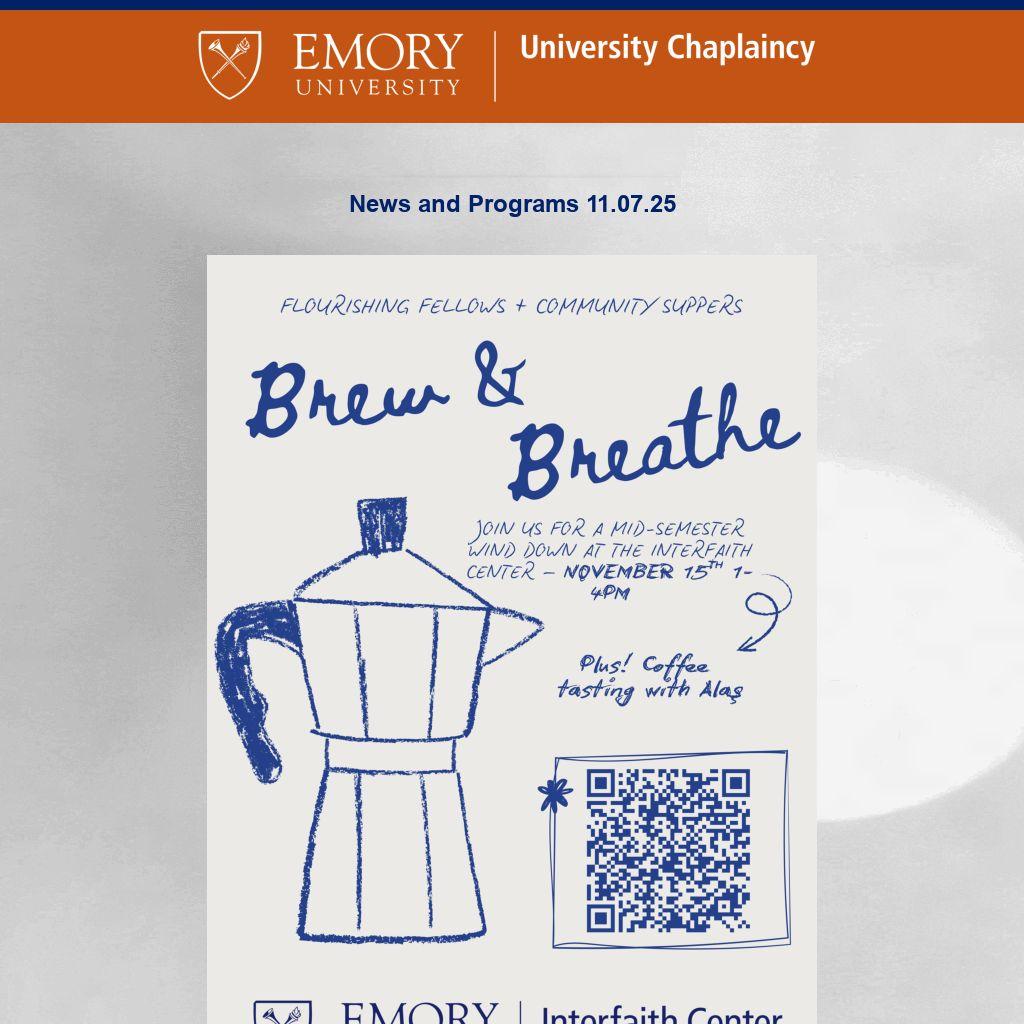 Emory University Chaplaincy ENews is published weekly during term by the Emory University Chaplaincy, publicizing Atlanta-campus spiritual life programs. It is not a comprehensive listing. For Oxford College spiritual life, please click here. To submit information or to update your preferences, please contact religiouslife@emory.edu.