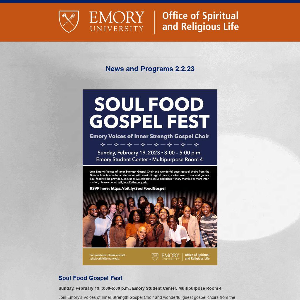 Join Emory's Voices of Inner Strength Gospel Choir and wonderful guest gospel choirs from the Greater Atlanta area for a celebration with music, liturgical dance, spoken word, trivia, and games. Soul food refreshments will be provided. Join us as we celebrate Jesus and Black History Month. For more information, please contact religiouslife@emory.edu. To RSVP, click here.