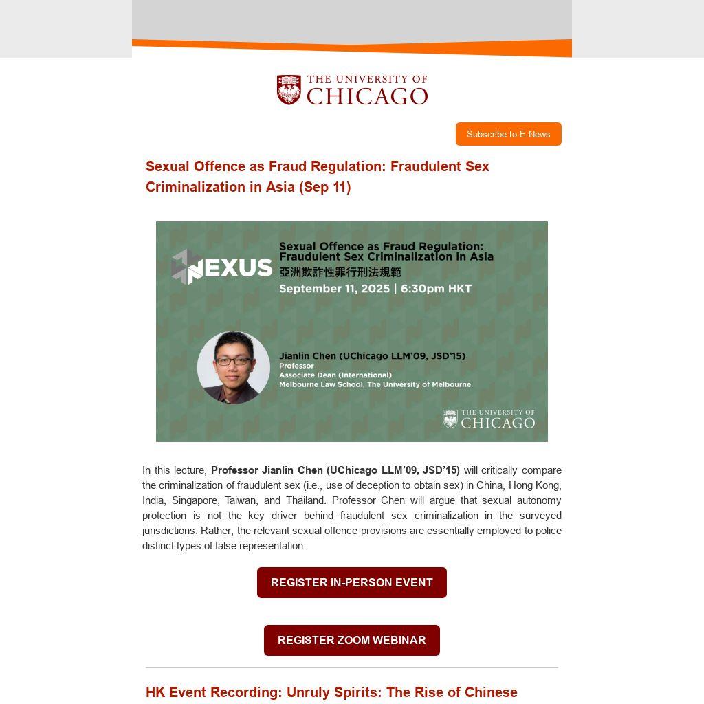In this lecture, Professor Jianlin Chen (UChicago LLM’09, JSD’15) will critically compare the criminalization of fraudulent sex (i.e., use of deception to obtain sex) in China, Hong Kong, India, Singapore, Taiwan, and Thailand. Professor Chen will argue that sexual autonomy protection is not the key driver behind fraudulent sex criminalization in the surveyed jurisdictions. Rather, the relevant sexual offence provisions are essentially employed to police distinct types of false representation.
