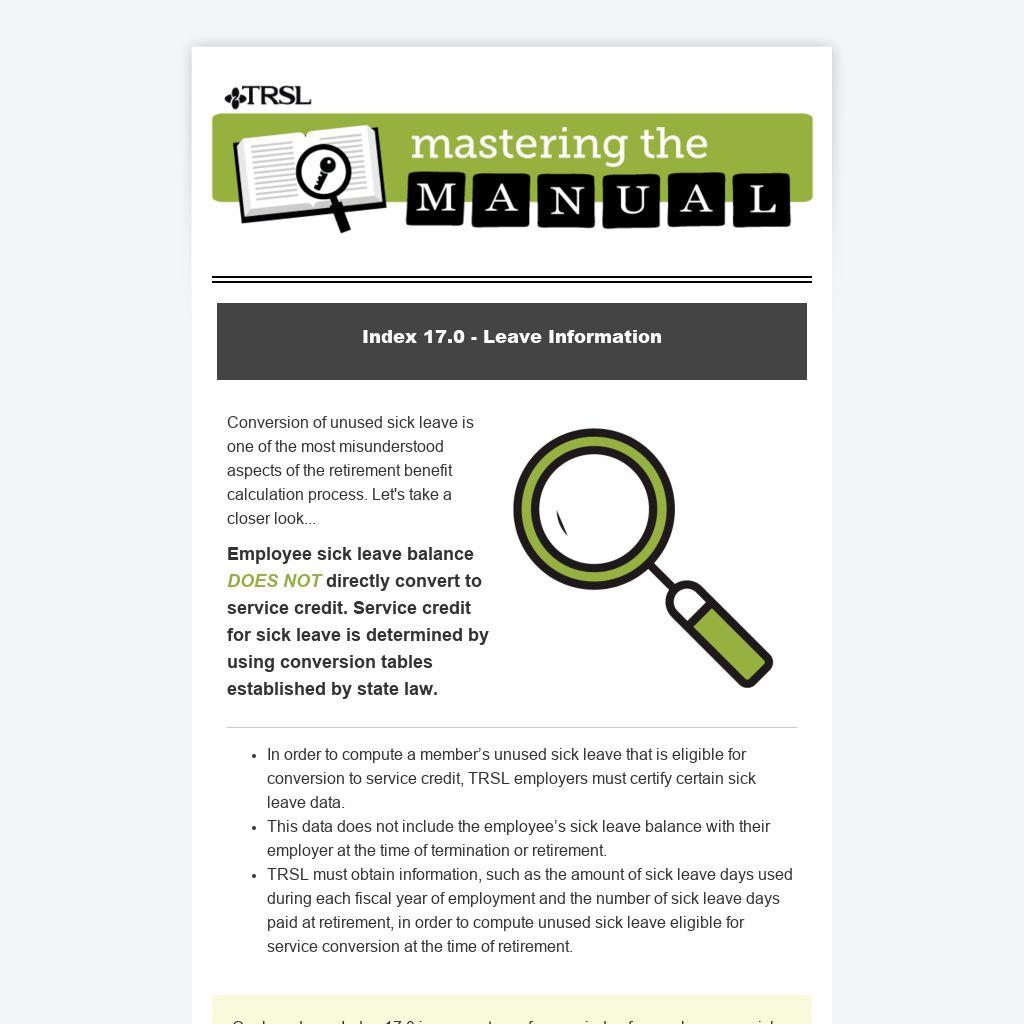 - In order to compute a member’s unused sick leave that is eligible for conversion to service credit, TRSL employers must certify certain sick leave data.