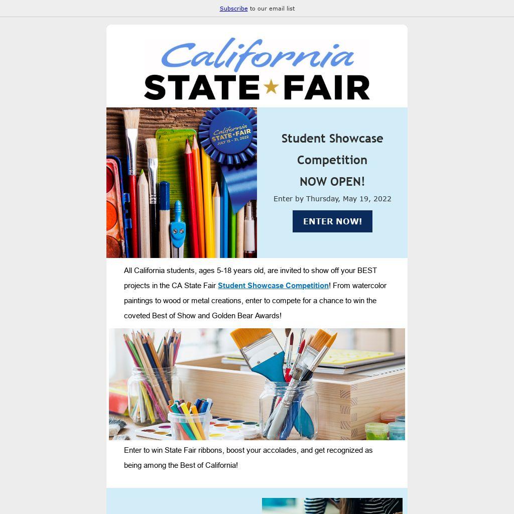 All California students, ages 5-18 years old, are invited to show off your BEST projects in the CA State Fair Student Showcase Competition! From watercolor paintings to wood or metal creations, enter to compete for a chance to win the coveted Best of Show and Golden Bear Awards!