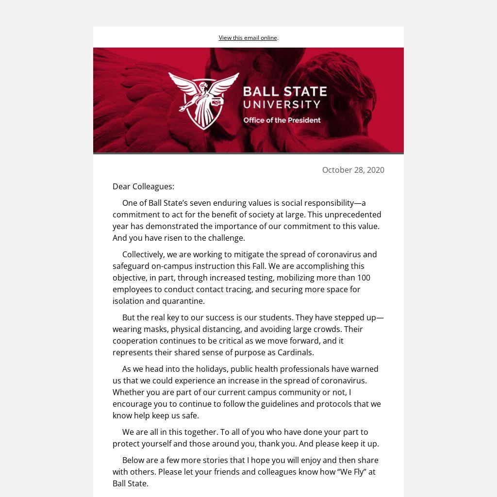 One of Ball State’s seven enduring values is social responsibility—a commitment to act for the benefit of society at large. This unprecedented year has demonstrated the importance of our commitment to this value. And you have risen to the challenge.