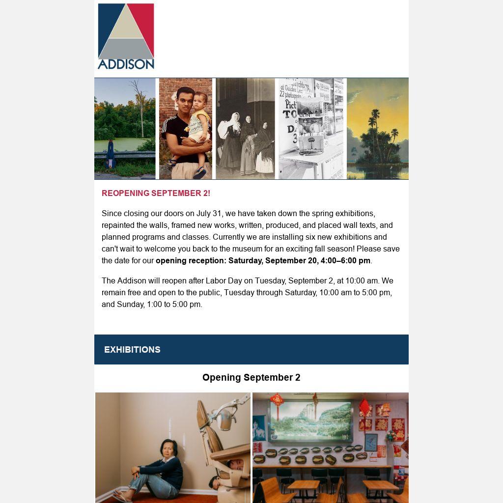 The Addison will reopen after Labor Day on Tuesday, September 2, at 10:00 am. We remain free and open to the public, Tuesday through Saturday, 10:00 am to 5:00 pm, and Sunday, 1:00 to 5:00 pm.