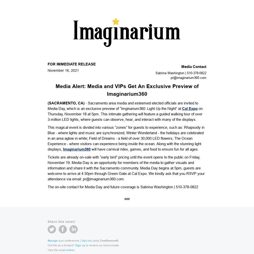 Tickets are already on-sale with “early bird” pricing until the event opens to the public on Friday, November 19. Media Day is an opportunity for members of the media to gather visuals and information and share it with the Sacramento community. Media Day begins at 5pm, guests are welcome to arrive at 4:30pm through Green Gate at Cal Expo. We kindly ask that you RSVP your attendance via email: pr@imaginarium360.com.