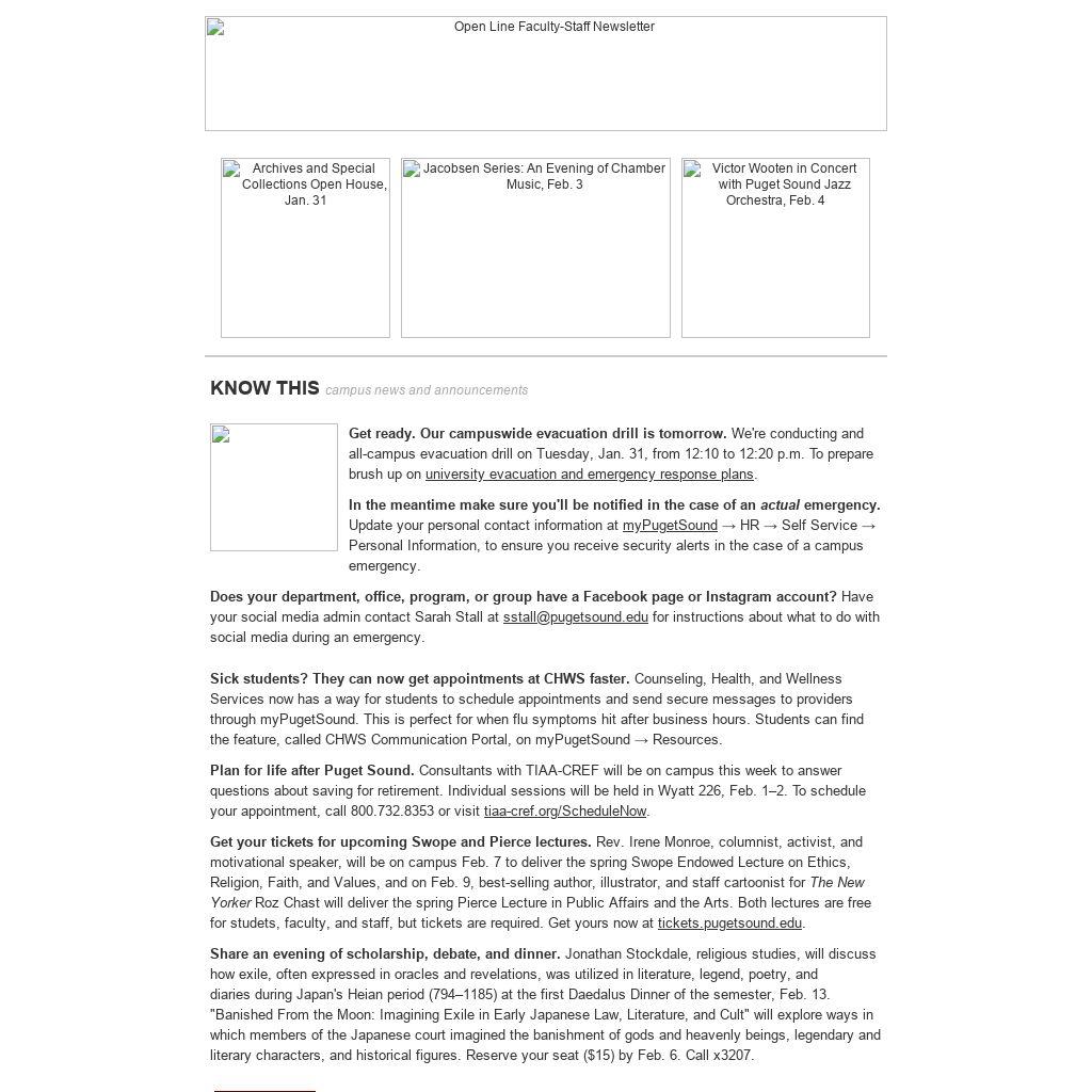 Does your department, office, program, or group have a Facebook page or Instagram account? Have your social media admin contact Sarah Stall at sstall@pugetsound.edu for instructions about what to do with social media during an emergency.