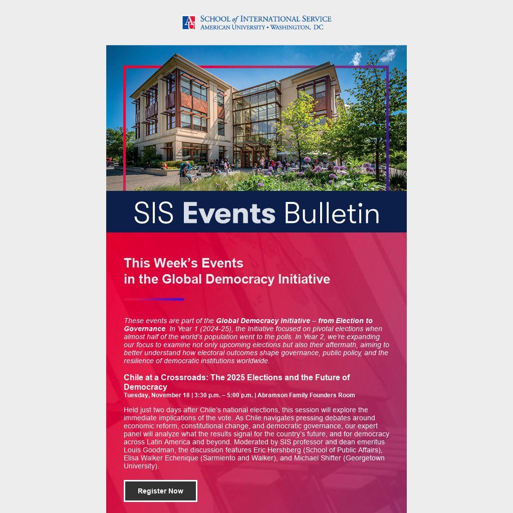 Held just two days after Chile’s national elections, this session will explore the immediate implications of the vote. As Chile navigates pressing debates around economic reform, constitutional change, and democratic governance, our expert panel will analyze what the results signal for the country’s future, and for democracy across Latin America and beyond. Moderated by SIS professor and dean emeritus Louis Goodman, the discussion features Eric Hershberg (School of Public Affairs), Elisa Walker Echenique (Sarmiento and Walker), and Michael Shifter (Georgetown University).