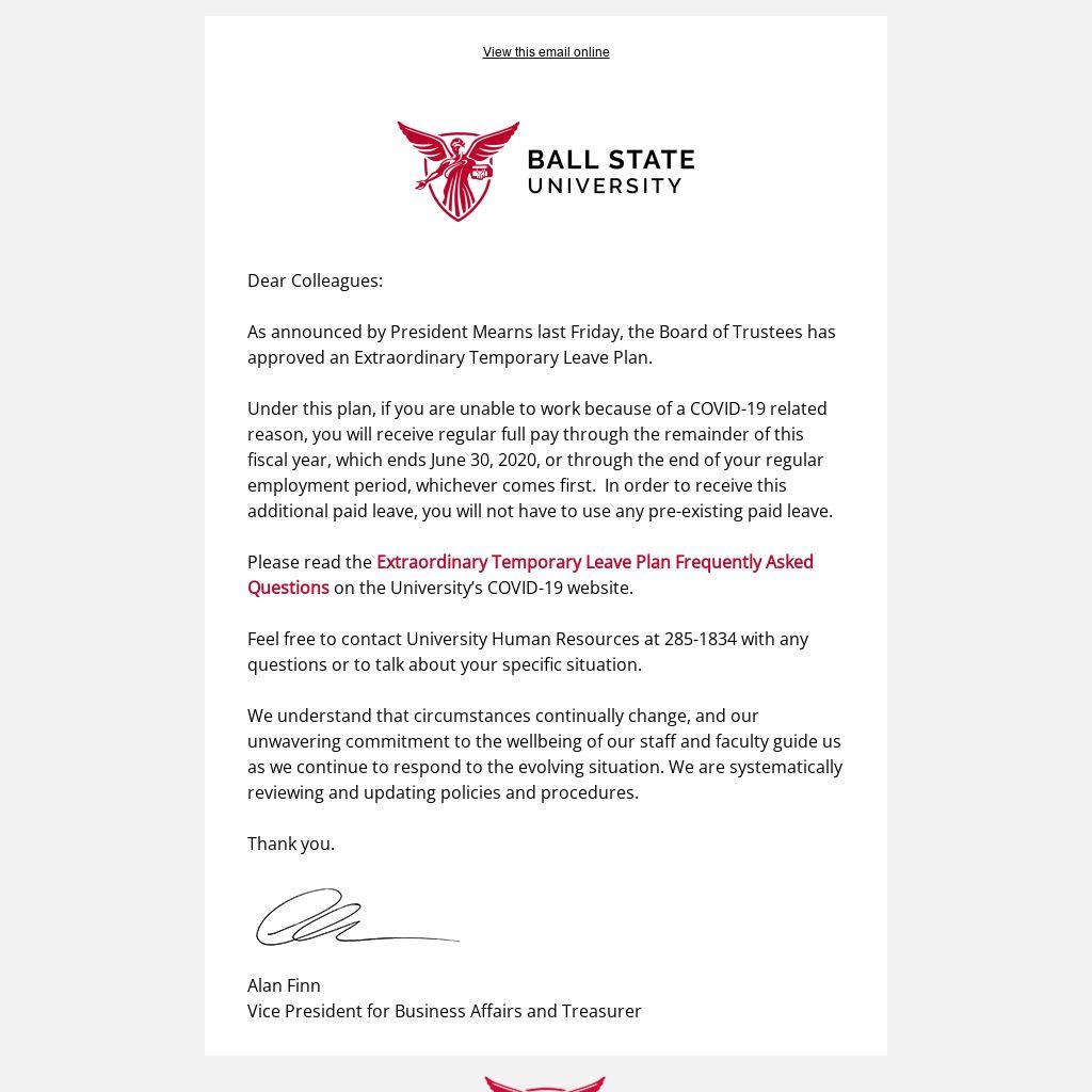 As announced by President Mearns last Friday, the Board of Trustees has approved an Extraordinary Temporary Leave Plan.