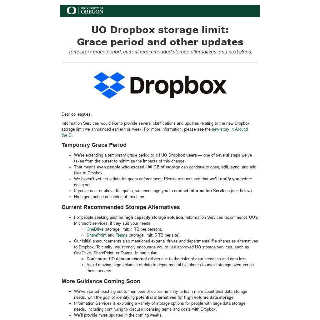 Information Services would like to provide several clarifications and updates relating to the new Dropbox storage limit we announced earlier this week. For more information, please see the new story in Around the O.