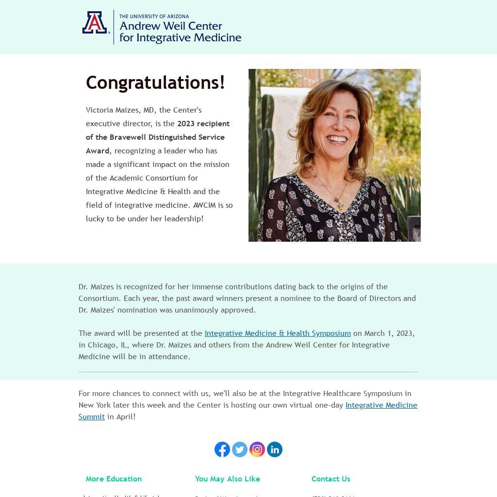 The award will be presented at the Integrative Medicine & Health Symposium on March 1, 2023, in Chicago, IL, where Dr. Maizes and others from the Andrew Weil Center for Integrative Medicine will be in attendance.