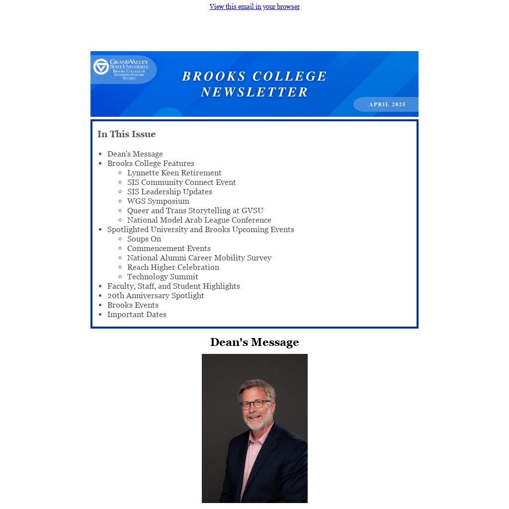 Fill out the form below to submit an event or announcement for the Brooks College Newsletter or email Kate VanDerKolk - vandkat@gvsu.edu