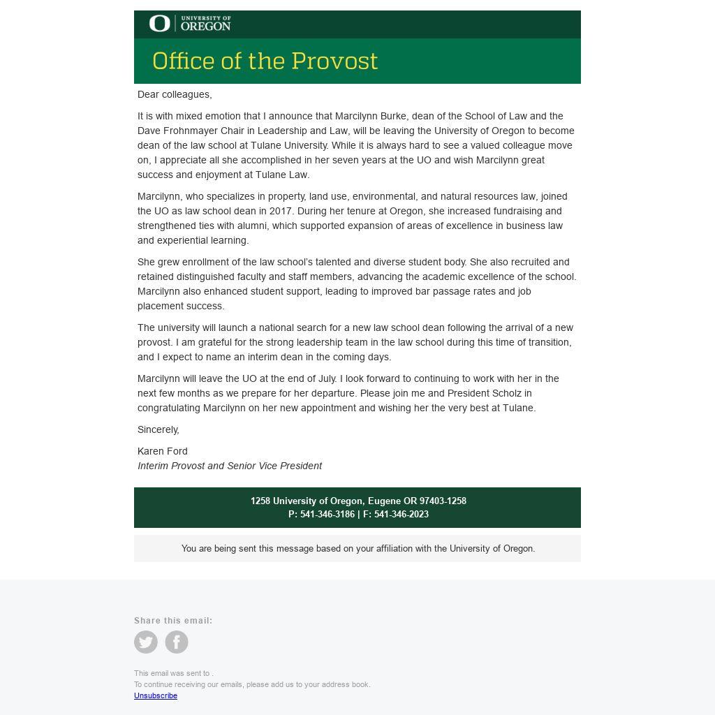 Marcilynn will leave the UO at the end of July. I look forward to continuing to work with her in the next few months as we prepare for her departure. Please join me and President Scholz in congratulating Marcilynn on her new appointment and wishing her the very best at Tulane.