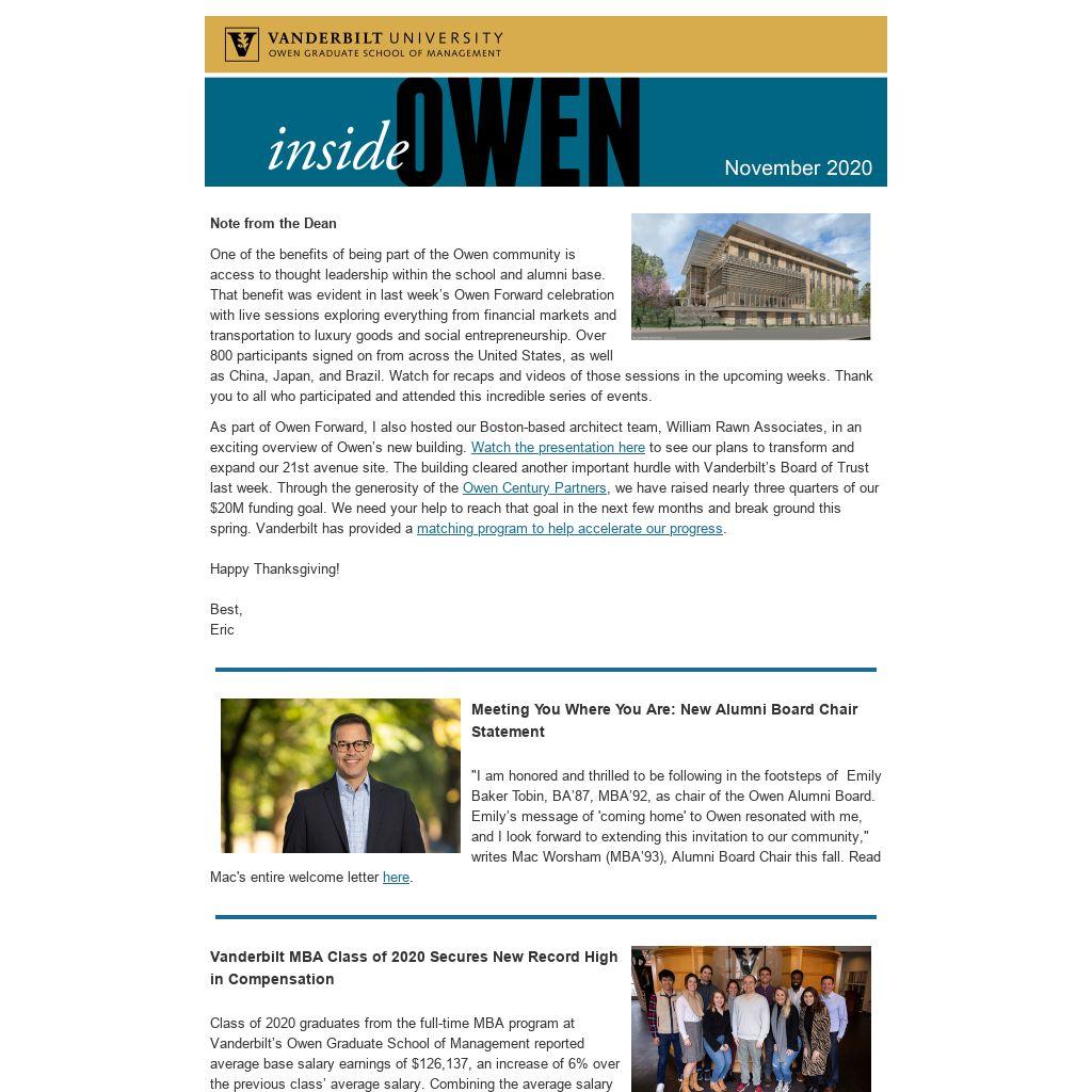 One of the benefits of being part of the Owen community is access to thought leadership within the school and alumni base. That benefit was evident in last week’s Owen Forward celebration with live sessions exploring everything from financial markets and transportation to luxury goods and social entrepreneurship. Over 800 participants signed on from across the United States, as well as China, Japan, and Brazil. Watch for recaps and videos of those sessions in the upcoming weeks. Thank you to all who participated and attended this incredible series of events.