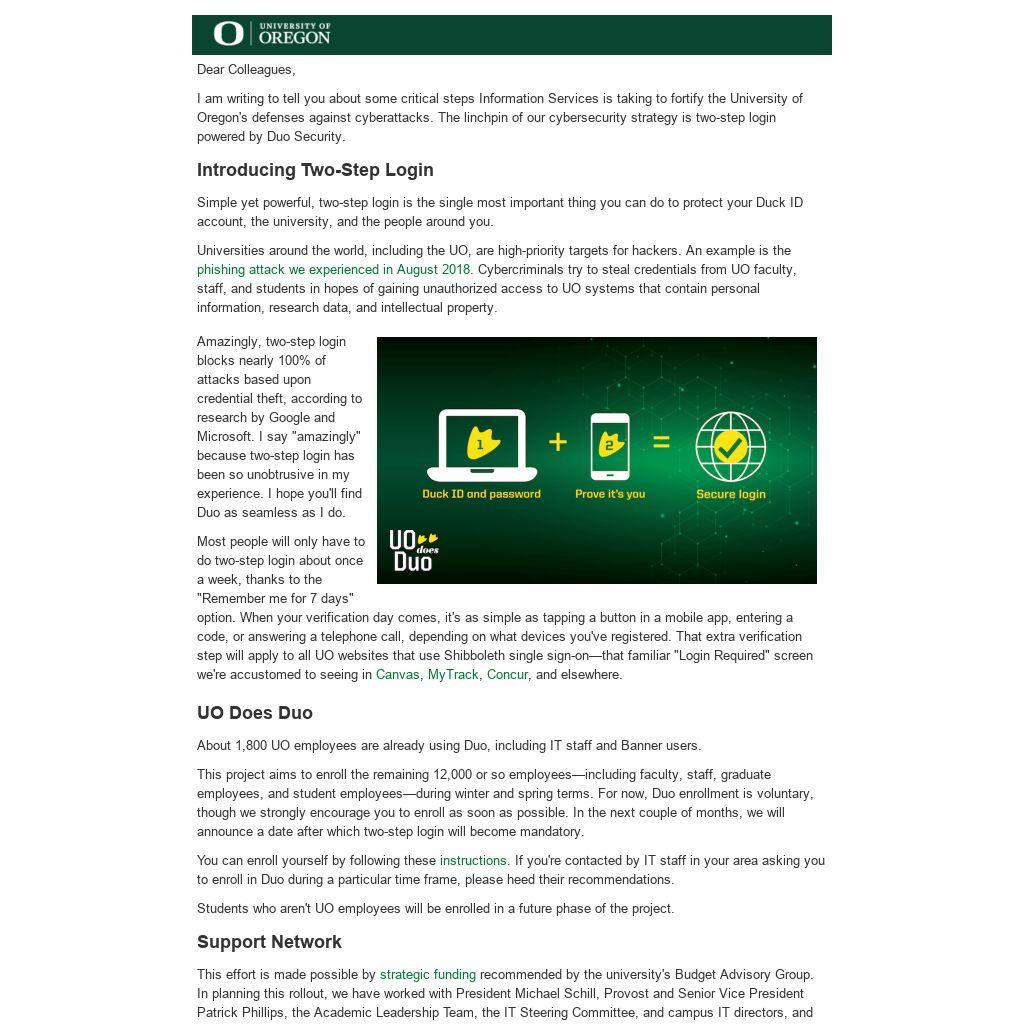 About 1,800 UO employees are already using Duo, including IT staff and Banner users.