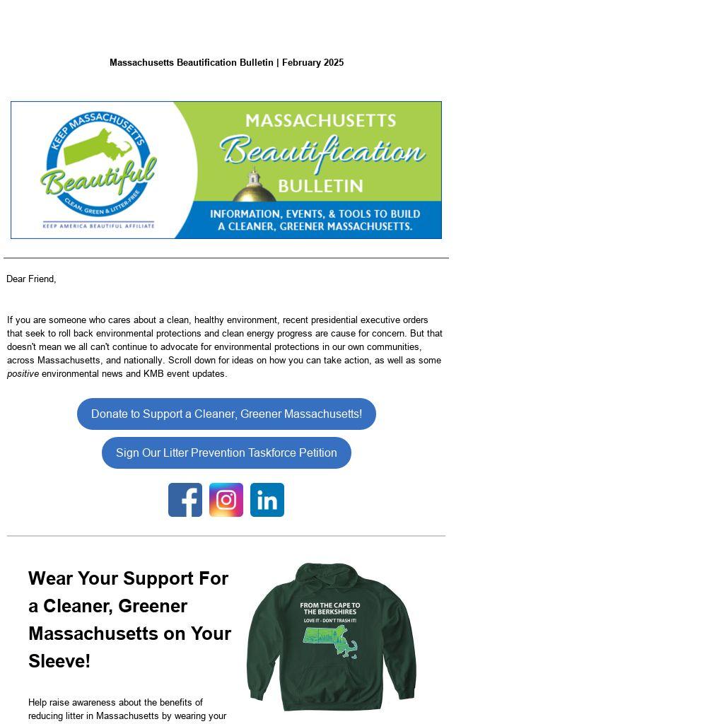 If you are someone who cares about a clean, healthy environment, recent presidential executive orders that seek to roll back environmental protections and clean energy progress are cause for concern. But that doesn't mean we all can't continue to advocate for environmental protections in our own communities, across Massachusetts, and nationally. Scroll down for ideas on how you can take action, as well as some positive environmental news and KMB event updates.
