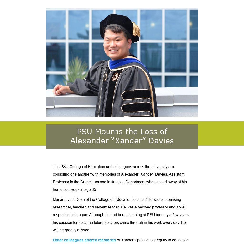 The PSU College of Education and colleagues across the university are consoling one another with memories of Alexander “Xander” Davies, Assistant Professor in the Curriculum and Instruction Department who passed away at his home last week at age 35.