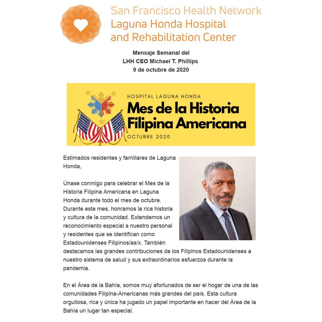 Únase conmigo para celebrar el Mes de la Historia Filipina Americana en Laguna Honda durante todo el mes de octubre. Durante este mes, honramos la rica historia y cultura de la comunidad. Extendemos un reconocimiento especial a nuestro personal y residentes que se identifican como Estadounidenses Filipinos/as/x. También destacamos las grandes contribuciones de los Filipinos Estadounidenses a nuestro sistema de salud y sus extraordinarios esfuerzos durante la pandemia.