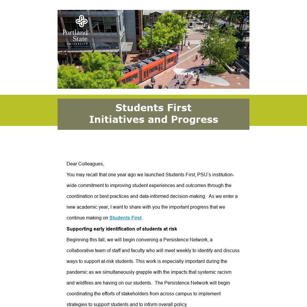 You may recall that one year ago we launched Students First, PSU’s institution-wide commitment to improving student experiences and outcomes through the coordination or best practices and data-informed decision-making. As we enter a new academic year, I want to share with you the important progress that we continue making on Students First.