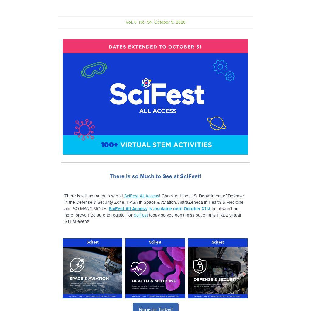 There is still so much to see at SciFest All Access! Check out the U.S. Department of Defense in the Defense & Security Zone, NASA in Space & Aviation, AstraZeneca in Health & Medicine and SO MANY MORE! SciFest All Accessis available until October 31st but it won't be here forever! Be sure to register for SciFest today so you don't miss out on this FREE virtual STEM event!