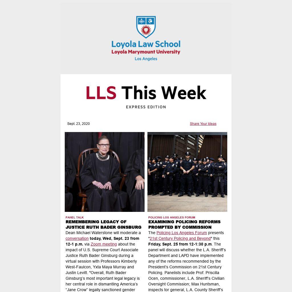 PANEL TALKREMEMBERING LEGACY OF JUSTICE RUTH BADER GINSBURGDean Michael Waterstone will moderate a conversation today, Wed, Sept. 23 from 12-1 p.m. via Zoom meeting about the impact of U.S. Supreme Court Associate Justice Ruth Bader Ginsburg during a virtual session with Professors Kimberly West-Faulcon, Yxta Maya Murray and Justin Levitt. "Overall, Ruth Bader Ginsburg’s most important legal legacy is her central role in dismantling America’s “Jane Crow” legally sanctioned gender hierarchy while never advocating gender-blindness," wrote Prof. West-Faulcon in her remembrance. See calendar listing or view Zoom details.