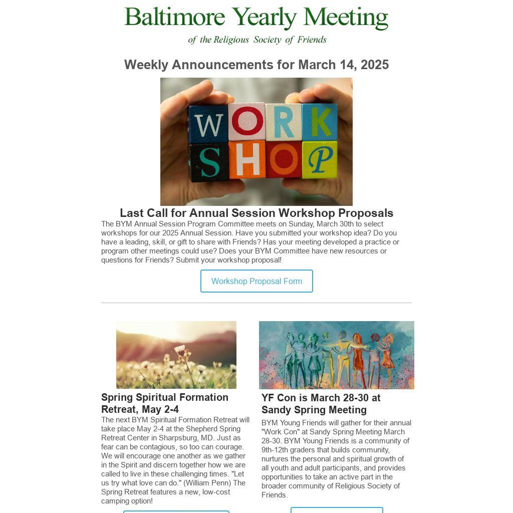 The BYM Annual Session Program Committee meets on Sunday, March 30th to select workshops for our 2025 Annual Session. Have you submitted your workshop idea? Do you have a leading, skill, or gift to share with Friends? Has your meeting developed a practice or program other meetings could use? Does your BYM Committee have new resources or questions for Friends? Submit your workshop proposal!
