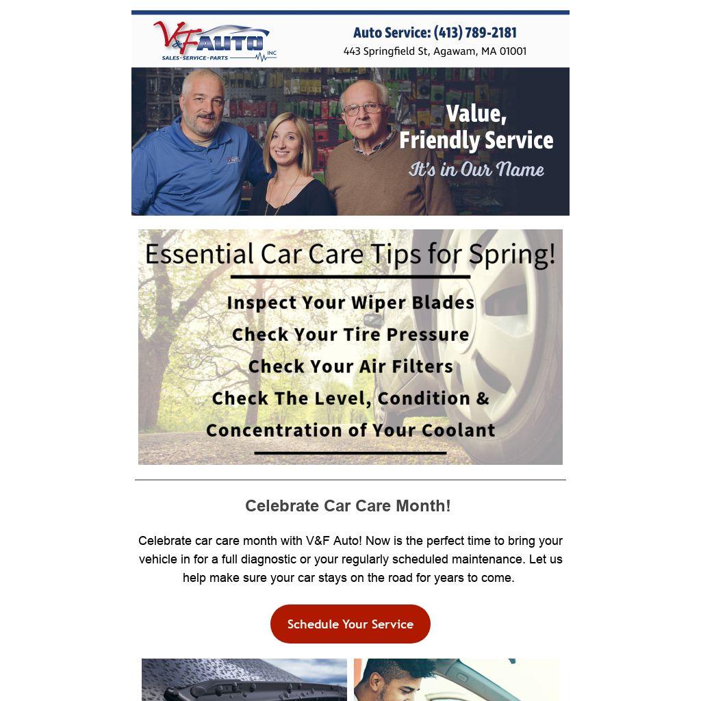 Celebrate car care month with V&F Auto! Now is the perfect time to bring your vehicle in for a full diagnostic or your regularly scheduled maintenance. Let us help make sure your car stays on the road for years to come.