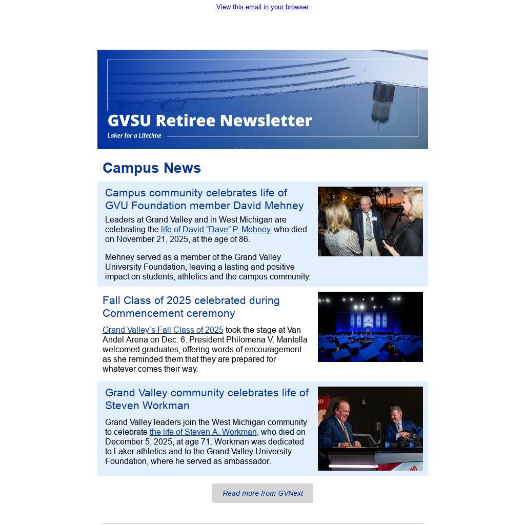 Leaders at Grand Valley and in West Michigan are celebrating the life of David “Dave” P. Mehney, who died on November 21, 2025, at the age of 86.