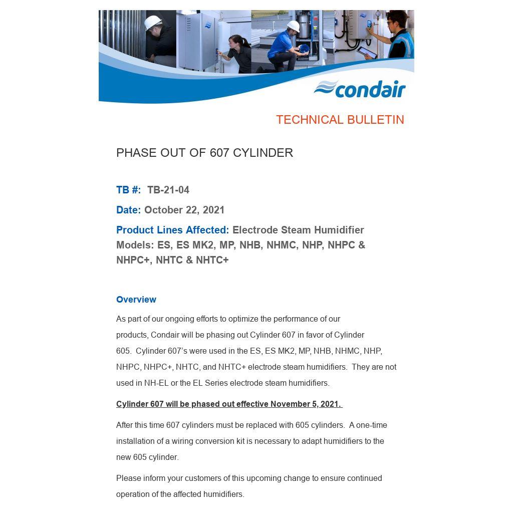 As part of our ongoing efforts to optimize the performance of our products, Condair will be phasing out Cylinder 607 in favor of Cylinder 605. Cylinder 607’s were used in the ES, ES MK2, MP, NHB, NHMC, NHP, NHPC, NHPC+, NHTC, and NHTC+ electrode steam humidifiers. They are not used in NH-EL or the EL Series electrode steam humidifiers.